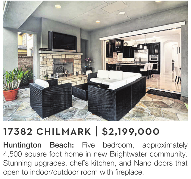 Huntington Beach: Five bedroom, approximately 4,500 square foot home in new Brightwater community. Stunning upgrades, chef’s kitchen, and Nano doors that open to indoor/outdoor room with fireplace.