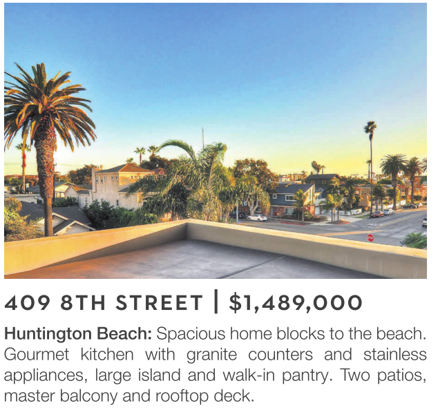 Huntington Beach: Spacious home blocks to the beach. Gourmet kitchen with granite counters and stainless appliances, large island and walk-in pantry. Two patios, master balcony and rooftop deck.