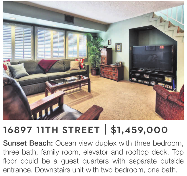 Sunset Beach: Ocean view duplex with three bedroom, three bath, family room, elevator and rooftop deck. Top floor could be a guest quarters with separate outside entrance. Downstairs unit with two bedroom, one bath.