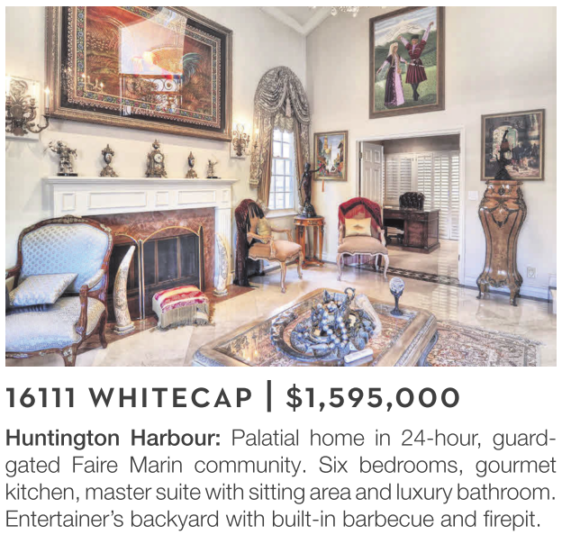 Huntington Harbour: Palatial home in 24-hour, guardgated Faire Marin community. Six bedrooms, gourmet kitchen, master suite with sitting area and luxury bathroom. Entertainer’s backyard with built-in barbecue and firepit.
