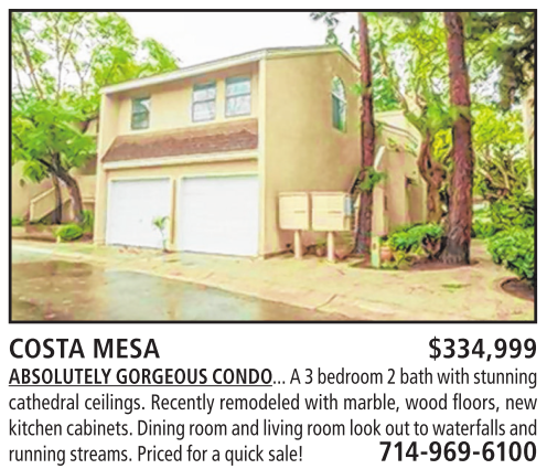 COSTA MESA $334,999 ABSOLUTELYGORGEOUSCONDO... A3bedroom2bathwithstunning cathedral ceilings. Recentlyremodeledwithmarble, wood floors, new kitchen cabinets. Diningroomand living room look out to waterfalls and runningstreams.Pricedfor aquick sale! 714-969-6100