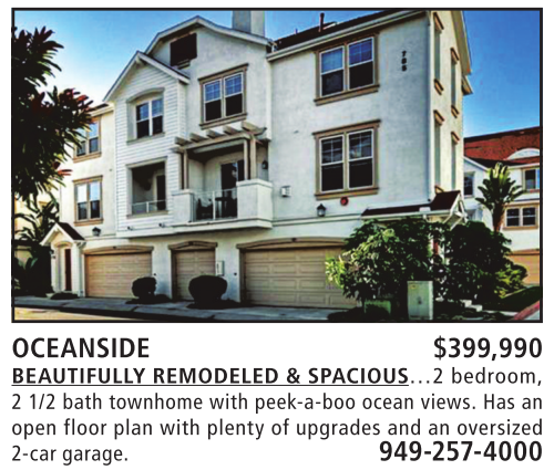 2 1/2 bath townhome with peek-a-boo ocean views. Has an open floor plan with plenty of upgrades and an oversized 2-car garage. 949-257-4000