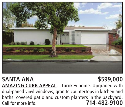 dual-paned vinyl windows, granite countertops in kitchen and baths, covered patio and custom planters in the backyard. Call formore info. 714-482-9100