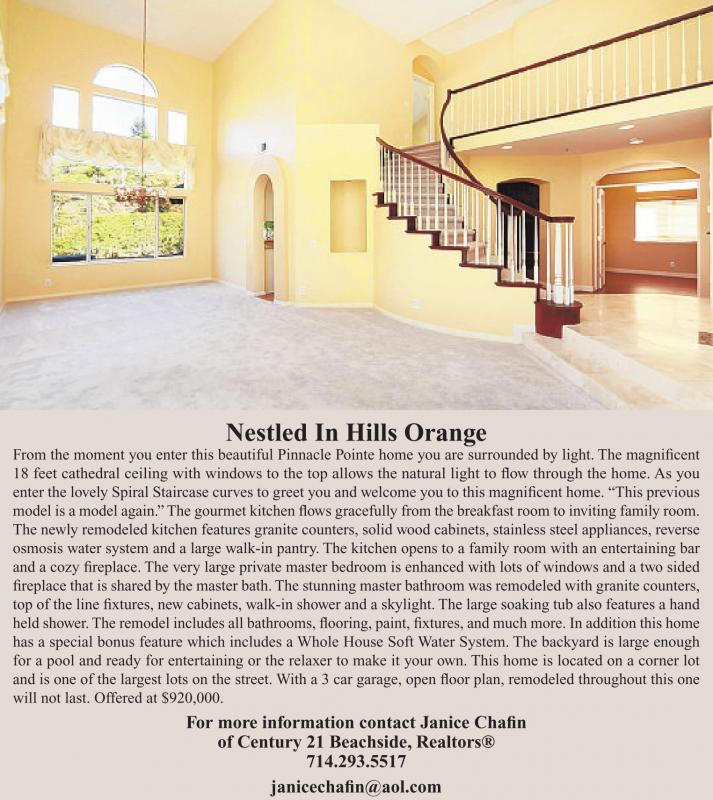 Nestled In Hills Orange From the moment you enter this beautiful Pinnacle Pointe home you are surrounded by light. The magnificent 18 feet cathedral ceiling with windows to the top allows the natural light to flow through the home. As you enter the lovely Spiral Staircase curves to greet you and welcome you to this magnificent home. “This previous model is a model again.” The gourmet kitchen flows gracefully from the breakfast room to inviting family room. The newly remodeled kitchen features granite counters, solid wood cabinets, stainless steel appliances, reverse osmosis water system and a large walk-in pantry. The kitchen opens to a family room with an entertaining bar and a cozy fireplace. The very large private master bedroom is enhanced with lots of windows and a two sided fireplace that is shared by the master bath. The stunning master bathroom was remodeled with granite counters, top of the line fixtures, new cabinets, walk-in shower and a skylight. The large soaking tub also features a hand held shower. The remodel includes all bathrooms, flooring, paint, fixtures, and much more. In addition this home has a special bonus feature which includes a Whole House Soft Water System. The backyard is large enough for a pool and ready for entertaining or the relaxer to make it your own. This home is located on a corner lot and is one of the largest lots on the street. With a 3 car garage, open floor plan, remodeled throughout this one will not last. Offered at $920,000. For more information contact Janice Chafin of Century 21 Beachside, Realtors® 714.293.5517 janicechafin@aol.com