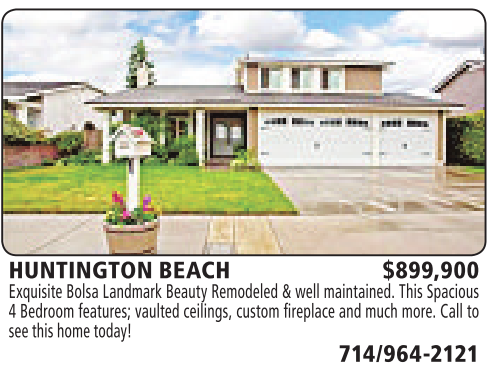 HUNTINGTON BEACH $899,900 Exquisite Bolsa Landmark Beauty Remodeled &well maintained. This Spacious 4Bedroom features; vaulted ceilings, custom fireplace and much more. Call to seethis home today!