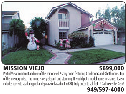 MISSION VIEJO $699,000 PartialView from frontand rear of this remodeled2storyhome featuring 4bedrooms and3bathrooms.Top of thelineupgrades. This home is very elegant andstunning. It wouldput amodelhometoshame. It also includes aprivatesparklingpooland spa as well as abuilt in BBQ. Trulypricedtosellfast !!! Call to seethis Gem! 949/597-4000 See also