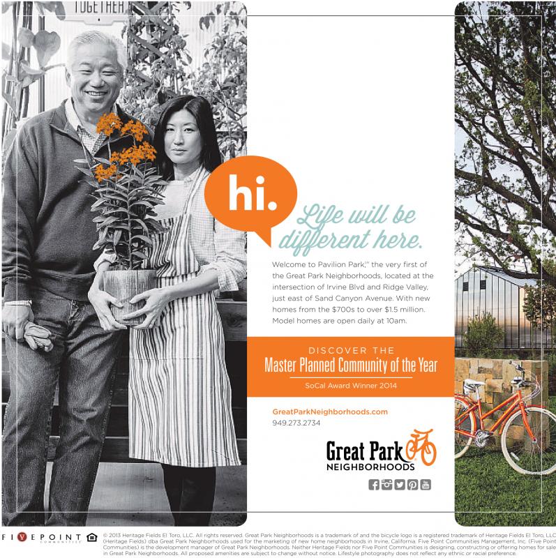 ©2013 Heritage Fields El Toro, LLC. All rights reserved. Great Park Neighborhoods is atrademark of and the bicycle logo is aregistered trademark of Heritage Fields El Toro, LLC (Heritage Fields) dba Great Park Neighborhoods used for the marketing of new home neighborhoods in Irvine, California. Five Point Communities Management, Inc. (Five Point Communities) is the development manager of Great Park Neighborhoods. Neither Heritage Fields nor Five Point Communities is designing, constructing or offering homes for sale in Great Park Neighborhoods. All proposed amenities are subject to change without notice. Lifestyle photography does not reflect any ethnic or racial preference.