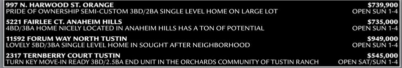 997 N. HARWOOD ST. ORANGE $739,900 PRIDE OF OWNERSHIP SEMI-CUSTOM 3BD/2BA SINGLE LEVEL HOME ON LARGE LOT OPEN SUN 1-4 5221 FAIRLEE CT. ANAHEIM HILLS $735,000 4BD/3BA HOME NICELY LOCATED IN ANAHEIM HILLS HAS A TON OF POTENTIAL OPEN SUN 1-4 11592 FORUM WAY NORTH TUSTIN $949,000 LOVELY 5BD/3BA SINGLE LEVEL HOME IN SOUGHT AFTER NEIGHBORHOOD OPEN SUN 1-4 2317 TERNBERRY COURT TUSTIN $545,000 TURN KEY MOVE-IN READY 3BD/2.5BA END UNIT IN THE ORCHARDS COMMUNITY OF TUSTIN RANCH OPEN SAT/SUN 1-4