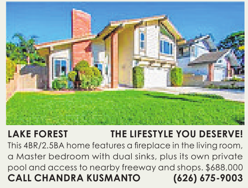 LAKE FOREST THE LIFESTYLE YOU DESERVE! This4BR/2.5BA home features afireplace in theliving room, aMaster bedroom with dual sinks, plus its own private pool and access to nearby freeway and shops. $688,000 CALL CHANDRA KUSMANTO (626) 675-9003 See also