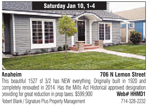 Anaheim Saturday Jan 10, 1-4 706 NLemon Street RobertBlank /Signature Plus Property Management 714-328-2232 This beautiful 1527 sf 3/2 has NEW everything. Originally built in 1920 and completely renovated in2014. Has the Mills Act Historical approved designation providing for great reduction in prop taxes. $599,900 Web# HHMD1