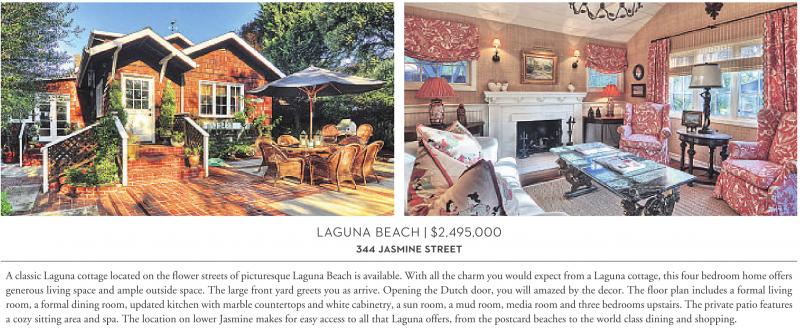 LAGUNA BEACH | $2,495,000 344 JASMINE STREET A classic Laguna cottage located on the flower streets of picturesque Laguna Beach is available. With all the charm you would expect from a Laguna cottage, this four bedroom home offers generous living space and ample outside space. The large front yard greets you as arrive. Opening the Dutch door, you will amazed by the decor. The floor plan includes a formal living room, a formal dining room, updated kitchen with marble countertops and white cabinetry, a sun room, a mud room, media room and three bedrooms upstairs. The private patio features a cozy sitting area and spa. The location on lower Jasmine makes for easy access to all that Laguna offers, from the postcard beaches to the world class dining and shopping.
