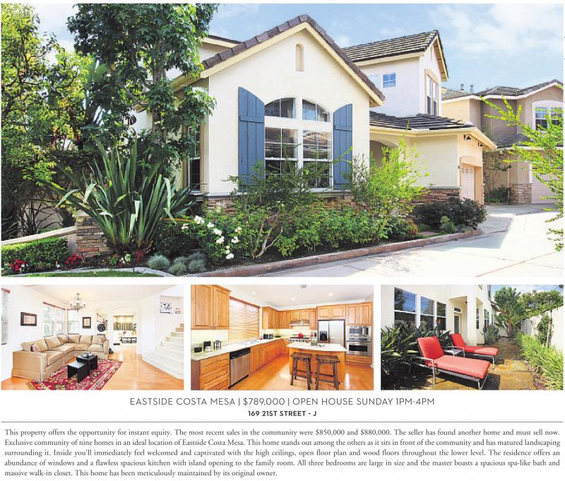 EASTSIDE COSTA MESA | $789,000 | OPEN HOUSE SUNDAY 1PM-4PM 169 21ST STREET - J This property offers the opportunity for instant equity. The most recent sales in the community were $850,000 and $880,000. The seller has found another home and must sell now. Exclusive community of nine homes in an ideal location of Eastside Costa Mesa. This home stands out among the others as it sits in front of the community and has matured landscaping surrounding it. Inside you'll immediately feel welcomed and captivated with the high ceilings, open floor plan and wood floors throughout the lower level. The residence offers an abundance of windows and a flawless spacious kitchen with island opening to the family room. All three bedrooms are large in size and the master boasts a spacious spa-like bath and massive walk-in closet. This home has been meticulously maintained by its original owner.