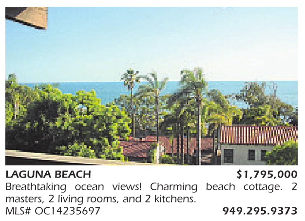 LAGUNA BEACH $1,795,000 Breathtaking ocean views! Charming beach cottage. 2 masters, 2 living rooms, and 2 kitchens. MLS# OC14235697 949.295.9373