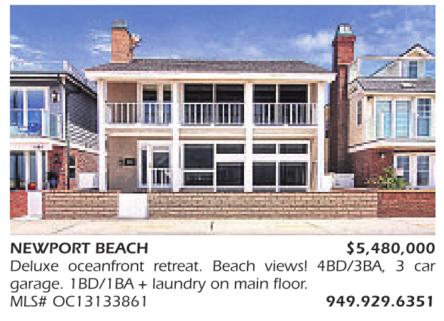 NEWPORT BEACH $5,480,000 Deluxe oceanfront retreat. Beach views! 4BD/3BA, 3 car garage. 1BD/1BA + laundry on main floor. MLS# OC13133861 949.929.6351