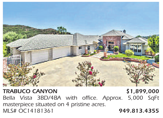 TRABUCO CANYON $1,899,000 Bella Vista 3BD/4BA with office. Approx. 5,000 SqFt masterpiece situated on 4 pristine acres. MLS# OC14181361 949.813.4355