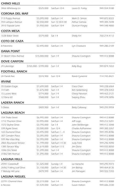 713 Poppy Avenue $3,095,000 Sat/Sun 1-4 Mark D. Simon 949.872.8322 703 Larkspur Avenue $2,550,000 Sun 12:30-4:30 Arthur Camoia 949.305.7698 3910 Topside Lane $1,950,000 Sat/Sun 10-4 Duncan Forgey 949.548.4800 Costa Mesa 1638 Baker Street $579,000 Sat 1-4 Shelly Fin 760.214.4112 Coto De Caza 8Palomino $2,495,000 Sat/Sun 1-4 Lyn Chadwick 949.280.2109 Dana Point 31 Beach View Avenue $15,000,000 Sun 1-4 Shauna Covington 949.412.8088 Dove Canyon 24 Lakeridge $765,000 -$799,000 Sun 1-4 Kelly Klug 949.874.7653 Foothill ranCh 24 Parrell Ave. $574,900 Sun 12-4 Randi Cymerint 714.745.8421 irvine 70 Golden Eagle $7,699,000 Sat/Sun 1-4 Clara Chen 949.228.6064 14 Faith $1,675,000 Sun 1-4 Kim Seidenberg 949.378.5353 15 Lucero West $774,800 Sun 1-4 Cheryl Newton 949.463.2121 12 Rana 60 $568,000 Sun 1-4 Saiping Zhou 949.478.5896 laDera ranCh 5Dietes $409,900 Sun 1-4 Betty Callaway 949.293.9954 laguna BeaCh 154 Thalia Street $6,995,000 Sat/Sun 1-4 Shauna Covington 949.412.8088 1712 Thurston Drive $3,995,000 Sat/Sun 1-4 Jeff Loge 949.212.5201 1572 Skyline Drive $3,795,000 Sat 1-4 John McMonigle 949.412.3048 339 Agate Street $3,500,000 Sun 12-4 Charles Aufhammer 949.300.3267 165 Dumond Drive $3,495,000 Sat/Sun 1–4 Shauna Covington 949.395.8786 307 Camden Place $3,395,000 Sat/Sun 1-4 Shauna Covington 949.412.8088 599 Alta Vista Way $2,395,000 Sat/Sun 1-4 Shauna Covington 949.412.8088 2865 Rounsevel Terrace $1,799,000 Sat/Sun 1-4:30 Judy Field 949.246.4090 1385 Terrace Way $1,619,000 Sat/Sun 11-5 Jim Doria 949.933.8050 1046 Oro Street $1,299,000 Sun 1-4 Shauna Covington 949.412.8088 31862 8th Avenue $1,295,000 Sat/Sun 1-4 Shauna Covington 949.412.8088 laguna hills 25941 Cedarbluff $1,325,000 Sunday 1-4 Liz Hansche 949.295.9373 26962 Falling Leaf Drive $1,150,000 Sat/Sun 1-4:30 Jim Bishop 949.464.8136 7Melody Hill Lane $479,999 Sat/Sun 1-4 Jim Flanagan 949.922.7355 laguna niguel 22791 Channel View $2,219,000 Sun 1-4 Shauna Covington 949.412.8088 6Nicosia $1,539,000 Sat/Sun 1-4 Susan Helton 949.606.2330