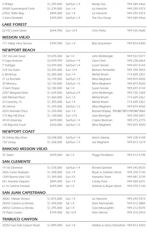 5Phillips $1,399,000 Sat/Sun 1-4 Randy Ora 949.584.4466 24585 Summerland Circle $1,239,000 Sun 1-4 Liz Hansche 949.295.9373 27831 Trellis Way $899,000 Sun 1-4 Liz Hansche 949.295.9373 3Saint Elizabeth $599,000 Sat/Sun 1-4 The Ora Group 949.584.4466 lake Forest 22192 Crane Street $644,990 Sun 12-4 Chris Perko 949.425.9600 Mission viejo 171 Valley View Terrace $399,900 Sun 1-4 Bob Strausheim 949.874.0300 newPort BeaCh 107 Via Lido Soud $9,695,000 Sat 1-4 John McMonigle 949.922.5577 9Cape Andover $3,599,999 Sat/Sun 1-4 Clara Chen 949.228.6064 7Trafalgar $3,499,000 Sat/Sun 1-4 Susan Sinclair 949.697.4144 218 Via Quito $2,595,000 Sun 12-4 Barbara Amstadter 949.290.3053 6Winthrop $2,285,000 Sun 1-4 Mehdi Khosh 714.609.2361 21 La Rochelle $2,199,000 Sat/Sun 1-5 Mina Maghami 949.874.4020 39 Monaco $2,150,000 Sat/Sun 1-5 Mina Maghami 949.874.4020 3Saint Tropez $2,100,000 Sat 1-4 Susan Sinclair 949.697.4144 2507 Margaret Drive $1,649,000 Sat/Sun 2-4 John McMonigle 949.735.1004 600 Michael Place $1,460,000 Sun 1-4 Mehdi Khosh 714.609.2361 23 Coventry 15 $1,395,000 Sun 1-4 Mehdi Khosh 714.609.2361 30 Vienna $1,299,000 Sat/Sun 1-5 Mina Maghami 949.874.4020 2024 Avenida Chico $1,250,000 Sun 1-4 Boman/Shipley 949.887.9871/949.887.9064 715 Bay Hill Drive $1,100,000 Sun 12-4 Joan Bannigan 949.290.5051 2418 University $699,000 Sat/Sun 1-4 Coleen Brennan 949.275.2775 120 Baycrest Court $650,000 Sat/Sun 1-5 Mina Maghami 949.874.4020 newPort Coast 54 Sidney Bay Drive $2,698,000 Sat/Sun 1-4 Aaron Valenty 949.228.4148 152 Lessay $1,268,000 Sat/Sun 1-5 Joe Maghami 949.813.1619 ranCho Mission viejo 37 Galan $699,000 Sat 1-4 Peggy Pendleton 949.412.4198 san CleMente 19 Via Divertirse $1,578,000 Sat/Sun 1-4 Richard Sprinkel 949.245.8525 2826 Canto Nubiado $1,398,000 Sun 1-4 Bryan &Siobhan Ulnick 949.370.7140 1509 Buena Vista 102 $1,349,000 Sun 2-5 Hartanov Team 949.481.3739 641 Avenida Vaquero $849,000 Sun 1-4 Candy Flock 949.584.6291 6116 Camino Forestal $699,000 Sat 1-4 Siobhan &Bryan Ulnick 949.370.7140 san juan CaPistrano 30061 Hillside Terrace $1,875,000 Sun 1-4 Liz Hansche 949.295.9373 28392 Camino La Ronda $1,449,000 Sat 1-4 Sheri Normandin 949.612.5884 28542 Camino La Ronda $1,295,000 Sat 1-4 Carol McLaughlin 949.212.0570 79 Plaza Cuesta $749,900 Sat 12-4 Sheri Dennis 949.310.2923 traBuCo Canyon 20352 Live Oak Canyon Road $1,899,000 Sun 1-4 Debbie &Gerry Derloshon 949.813.4355