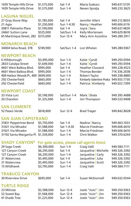 NEWPORT BEACH 6Hillsborough $3,495,000 Sun 1-4 Katie | Cyndi 949.293.0594 2833 CatalpaStreet $1,649,000 Sun 1-4 Katie | Cyndi 949.293.0594 4601 West BalboaBlvd. $995,000 Sat 1-4 HeatherCloward 949.228.4523 4601 West BalboaBlvd. $995,000 Sun 1-4 ThomasBender 714.336.2038 409Harbor WoodsPl.,409 $699,000 Sun 1-4 Robert Taylor 949.338.8885 292Chesterfield $665,000 Sat 1-4 Kimberly Valentine-Poska 949.933.7730 292Chesterfield $665,000 Sun 1-4 Patricia | Kimberly 949.922.7399 NEWPORT COAST 33 VistaLuci $5,198,000 Sat/Sun 1-4 Mark | Shala 949.395.4688 20 Chandon $1,325,000 Sun 1-4 Jim Thompson 949.533.9408 SAN CLEMENTE 52 PaseoVerde $618,800 Sun 12-4 Brad Trager 949.842.8028 SAN JUAN CAPISTRANO 31831PeppertreeBend $5,750,000 Sat 1-4 Nadine | Nancy 949.463.1033 31021Via Mirador $1,588,000 Sat 1-4:30 Marcie Friedman 949.606.6610 31021Via Mirador $1,588,000 Sun 1-4 Marcie Friedman 949.606.6610 31192SantaMargaritaPl. $1,339,000 Sun 1-4 Chris Walker 949.370.6244 SHADY CANYON ® For gate access, please call agents listed. 29 Sage Creek $6,300,000 Sun 1-4 Craig Valli 949.584.7111 127CanyonCreek $6,295,000 Sat 1-4 Jacqueline | Michelle 949.326.3392 127CanyonCreek $6,295,000 Sun 1-4 Jacqueline | Carly 949.326.3392 31 Watercress $5,495,000 Sat 1-4 Jacqueline | Julia 949.326.3392 31 Watercress $5,495,000 Sun 1-4 Jacqueline | Scott 949.326.3392 15 Wildhawk $3,795,000 Sun 1-4 Craig Valli 949.584.7111 TRABUCO CANYON 30 Riverview Drive $695,000 Sat 1-4 SusanMcDonnell 949.632.0544 TURTLE RIDGE 23 Milrose $2,588,000 Sun 12-4 Joele “JoJo” | Jim 949.350.9363 52 Sweet Bay $1,568,000 Sun 12-4 Joele “JoJo” | Jim 949.350.9363 41 Shade Tree $1,225,000 Sun 12-4 Joele “JoJo” | Jim 949.350.9363