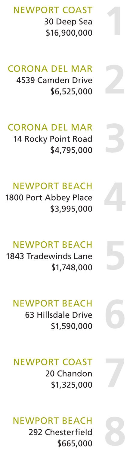 NEWPORT COAST 30 Deep Sea $16,900,000 CORONA DEL MAR 4539 Camden Drive $6,525,000 1 2 CORONA DEL MAR 14 Rocky Point Road $4,795,000 3 NEWPORT BEACH 1800 Port Abbey Place $3,995,000 4 NEWPORT BEACH 1843 Tradewinds Lane $1,748,000 5 NEWPORT BEACH 63 Hillsdale Drive $1,590,000 6 NEWPORT COAST 20 Chandon $1,325,000 7 NEWPORT BEACH 292 Chesterfield $665,000 8