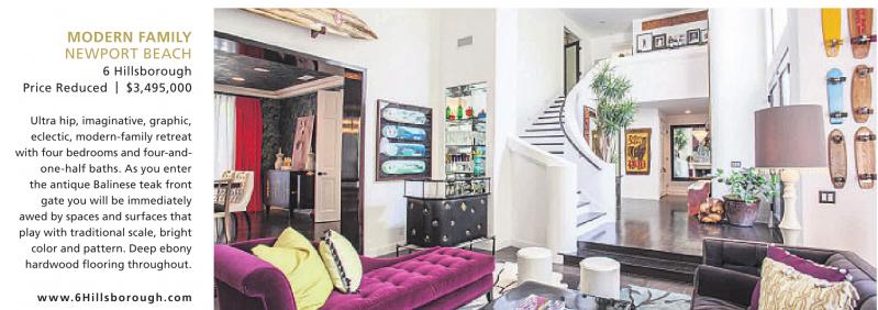 MODERN FAMILY NEWPORT BEACH 6 Hillsborough Price Reduced | $3,495,000 Ultra hip, imaginative, graphic, eclectic, modern-family retreat with four bedrooms and four-andone-half baths. As you enter the antique Balinese teak front gate you will be immediately awed by spaces and surfaces that play with traditional scale, bright color and pattern. Deep ebony hardwood flooring throughout. www.6Hillsborough.com