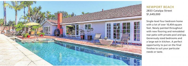 NEWPORT BEACH 2833 Catalpa Street $1,649,000 Single-level four bedroom home with a lot of over 10,454 square feet. Newly painted throughout with new flooring and remodeled rear patio with private pool and spa. Generously sized bedrooms and a large eat-in kitchen. A perfect opportunity to put on the final finishes to suit your particular needs or taste. See also