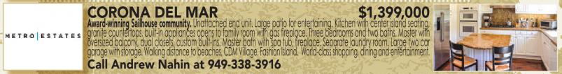 CORONA DEL MAR $1,399,000 Award-winning Sailhouse community. Unattached end unit. Large patio for entertaining. Kitchen with center island seating, granite countertops, built-in appliances opens tofamily room with gas fireplace. Three bedrooms and two baths. Master with oversized balcony, dual closets, custom built-ins. Master bath with spa tub, fireplace. Separate laundry room. Large two car garage with storage. Walkingdistancetobeaches, CDMVillage, FashionIsland. World-classshopping, dining andentertainment. Call Andrew Nahin at 949-338-3916