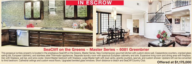 IN ESCROW SeaCliff on the Greens ~ Master Series ~ 6081 Greenbrier This gorgeous turnkeyproperty is locatedinthe prestigiousSeaCliffonthe Greens,MasterSeries. NewContemporary gourmet kitchenwithcustomstone wall,Ceasarstone counters,cracked glass eating bar, European cabinetry, and stainless steel Thermador appliances. Separate laundry room with spacious European cabinetry and sink. Expansive living room and dining area with fireplace. Den with fireplace, wet bar, and wine cooler. Grand Master bedroom with fireplace. Large Master bath with dual vanity, granite counters, spa tub, and custom shower. Upstairs loft can be converted to third bedroom. Cathedral ceilings and custom wood floors. Upgraded beveled glass windows. Short distance to beach and SeaCliff Country Club. Offered at $1,175,000