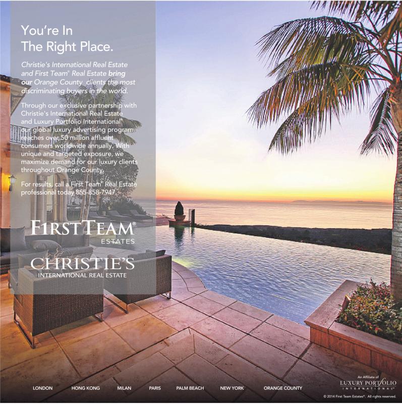 You’re In The Right Place. Christie's International Real Estate and First Team ® Real Estate bring our Orange County clients the most discriminating buyers in the world. Through our exclusive partnership with Christie's International Real Estate and Luxury Portfolio International ® our global luxury advertising program reaches over 50 million affluent consumers worldwide annually. With unique and targeted exposure, we maximize demand for our luxury clients throughout Orange County. For results, call a First Team ® Real Estate professional today 855-858-7947. An Affiliate of LONDON HONG KONG MILAN PARIS PALM BEACH NEW YORK ORANGE COUNTY ©2014 First Team Estates ® . All rights reserved. ©2014 First Team Estates ® . All rights reserved.
