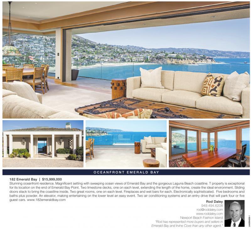 O C E A N F R O N T E M E R A L D B AY 182 Emerald Bay | $15,999,000 Stunning oceanfront residence. Magnificent setting with sweeping ocean views of Emerald Bay and the gorgeous Laguna Beach coastline. T property is exceptional for its location on the end of Emerald Bay Point. Two limestone decks, one on each level, extending the length of the home, create the ideal environment. Sliding doors stack to bring the coastline inside. Two great rooms, one on each level. Fireplaces and wet bars for each. Electronically sophisticated. Five bedrooms and baths plus powder. An elevator, making entertaining on the lower level an easy event. Two air conditioning systems and an entry drive that will park four or five guest cars. www.182emeraldbay.com Rod Daley 949.494.6208 rod@roddaley.com www.roddaley.com Newport Beach Fashion Island “Rod has represented more buyers and sellers in Emerald Bay and Irvine Cove than any other agent.”