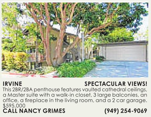 aMaster suite with awalk-incloset, 3large balconies, an office, afireplace in the living room, and a2car garage. $595,000 CALL NANCY GRIMES (949) 254-9069