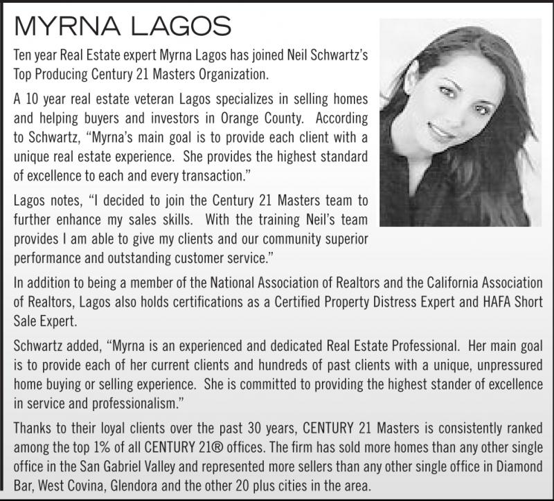 MYRNA LAGOS TenyearRealEstate expert MyrnaLagos hasjoinedNeilSchwartz’s Top Producing Century 21 Masters Organization. A 10 year real estate veteran Lagos specializes in selling homes and helping buyers and investors in Orange County. According to Schwartz, “Myrna’s main goal is to provide each client with a unique real estate experience. She provides the highest standard of excellence to each and every transaction.” Lagos notes, “I decided to join the Century 21 Masters team to further enhance my sales skills. With the training Neil’s team provides I am able to give my clients and our community superior performance and outstanding customer service.” In addition to being a member of the National Association of Realtors and the California Association of Realtors, Lagos also holds certifications as a Certified Property Distress Expert and HAFA Short Sale Expert. Schwartz added, “Myrna is an experienced and dedicated Real Estate Professional. Her main goal is to provide each of her current clients and hundreds of past clients with a unique, unpressured home buying or selling experience. She is committed to providing the highest stander of excellence in service and professionalism.” Thanks to their loyal clients over the past 30 years, CENTURY 21 Masters is consistently ranked among the top 1% of all CENTURY 21® offices. The firm has sold more homes than any other single office in the San Gabriel Valley and represented more sellers than any other single office in Diamond Bar, West Covina, Glendora and the other 20 plus cities in the area.