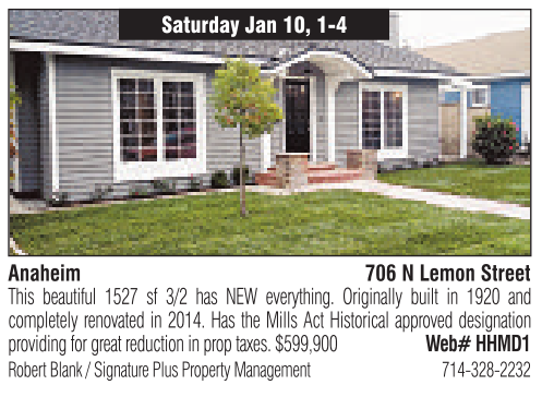 Anaheim Saturday Jan 10, 1-4 706 NLemon Street RobertBlank /Signature Plus Property Management 714-328-2232 This beautiful 1527 sf 3/2 has NEW everything. Originally built in 1920 and completely renovated in2014. Has the Mills Act Historical approved designation providing for great reduction in prop taxes. $599,900 Web# HHMD1