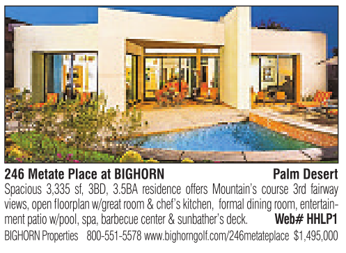 246 Metate Place at BIGHORN Palm Desert Spacious 3,335 sf, 3BD, 3.5BA residence offers Mountain’s course 3rd fairway views, open floorplan w/great room &chef’skitchen, formal dining room,entertainment patio w/pool, spa, barbecue center&sunbather’s deck. Web# HHLP1 BIGHORN Properties 800-551-5578 www.bighorngolf.com/246metateplace $1,495,000