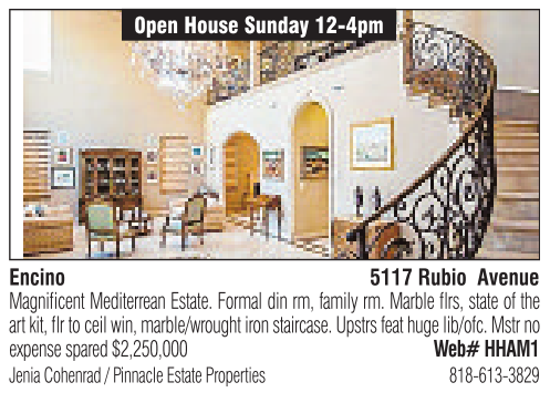 Encino 0pen House Sunday 12-4pm 5117 Rubio Avenue Magnificent Mediterrean Estate. Formal dinrm, familyrm. Marble flrs, state of the artkit, flr to ceil win, marble/wroughtironstaircase. Upstrs feat huge lib/ofc. Mstr no expense spared$2,250,000 Web# HHAM1 Jenia Cohenrad /Pinnacle Estate Properties 818-613-3829