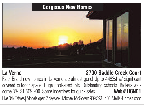 Gorgeous New Homes La Verne 2700 Saddle Creek Court Live Oak Estates|Models open 7days/wk|Michael McGovern 909.593.1405 Melia-Homes.com Rare! Brand new homes in La Verne are almost gone! Up to 4463sf w/ significant covered outdoor space. Huge pool-sized lots. Outstanding schools. Brokers welcome 3%.$1,509,900.Someincentives for quicksales. Web# HGND1