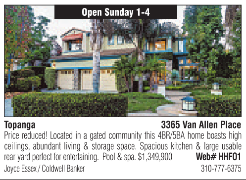 Open Sunday 1-4 Topanga 3365 VanAllen Place Price reduced! Located in agated community this 4BR/5BA home boasts high ceilings, abundant living & storage space. Spacious kitchen & large usable rear yardperfect for entertaining. Pool &spa. $1,349,900 Web# HHFO1 Joyce Essex /Coldwell Banker 310-777-6375
