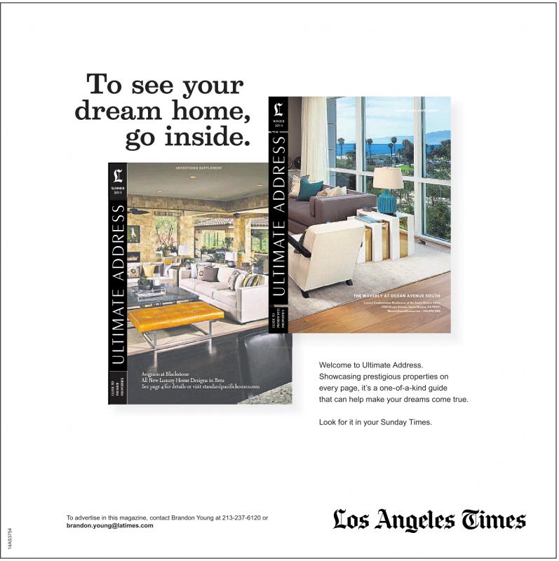 To see your dream home, go inside. WINTER 2014 SUMMER 2013 THE WAVERLY AT OCEAN AVENUE SOUTH Luxury Condominium Residences at the Santa Monica Shore 1705 Ocean Avenue, Santa Monica, CA 90401 WaverlySantaMonica.com •310.394.1100 Welcome to Ultimate Address. Showcasing prestigious properties on every page, it’s a one-of-a-kind guide that can help make your dreams come true. Look for it in your Sunday Times. To advertise in this magazine, contact Brandon Young at 213-237-6120 or brandon.young@latimes.com