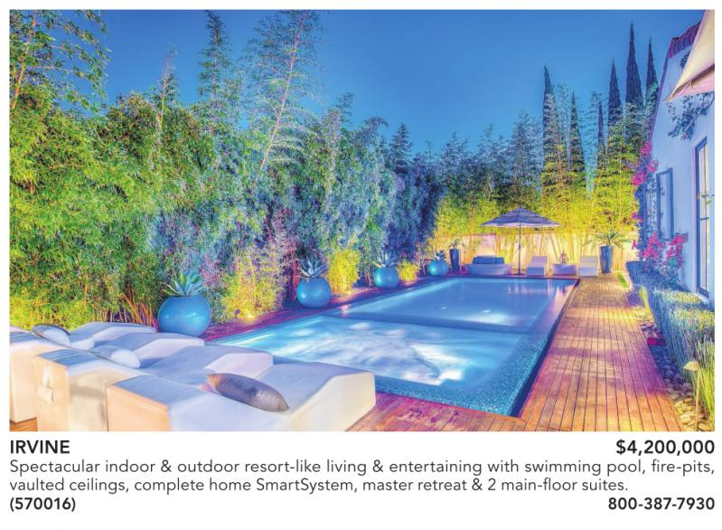 IRVINE $4,200,000 Spectacular indoor & outdoor resort-like living & entertaining with swimming pool, fire-pits, vaulted ceilings, complete home SmartSystem, master retreat & 2 main-floor suites. (570016) 800-387-7930