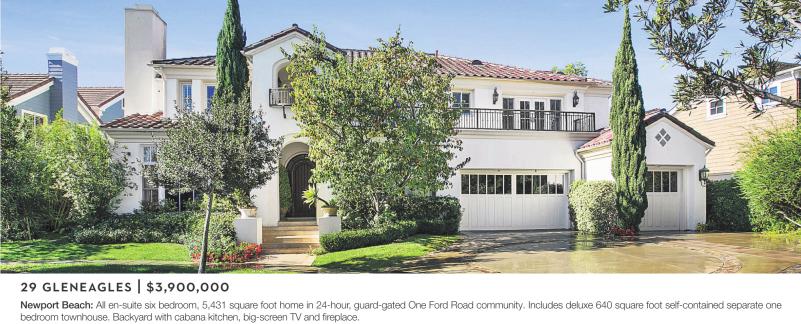 Newport Beach: All en-suite six bedroom, 5,431 square foot home in 24-hour, guard-gated One Ford Road community. Includes deluxe 640 square foot self-contained separate one bedroom townhouse. Backyard with cabana kitchen, big-screen TV and fireplace.