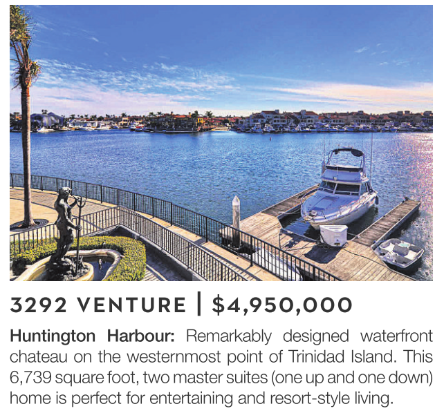 Huntington Harbour: Remarkably designed waterfront chateau on the westernmost point of Trinidad Island. This 6,739 squarefoot,two master suites (oneupand one down) home is perfect for entertaining and resort-style living.