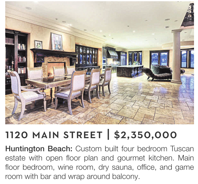 Huntington Beach: Custom built four bedroom Tuscan estate with open floor plan and gourmet kitchen. Main floor bedroom, wine room, dry sauna, office, and game room with bar and wrap around balcony.