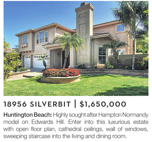 HuntingtonBeach: Highly soughtafter Hampton Normandy model on Edwards Hill. Enter into this luxurious estate with open floor plan, cathedral ceilings, wall of windows, sweeping staircase into the living and dining room.