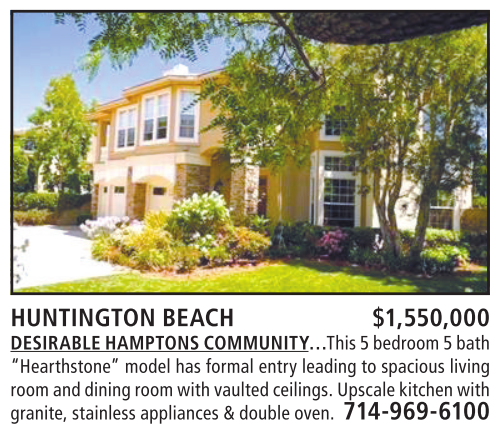 HUNTINGTON BEACH $1,550,000 DESIRABLEHAMPTONSCOMMUNITY…This 5bedroom 5bath “Hearthstone” model has formal entry leading to spacious living room and diningroomwithvaulted ceilings.Upscale kitchen with granite, stainless appliances&double oven. 714-969-6100
