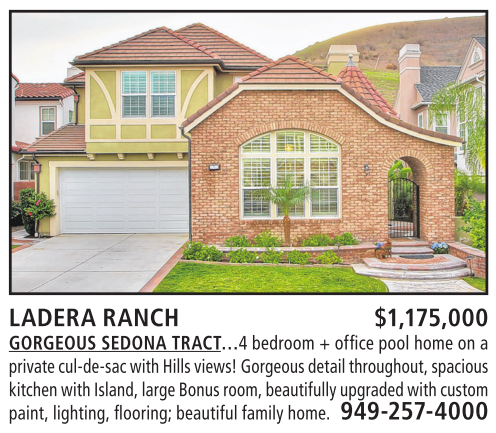 LADERA RANCH $1,175,000 GORGEOUS SEDONA TRACT…4 bedroom +office pool home ona private cul-de-sac with Hillsviews!Gorgeousdetailthroughout, spacious kitchen with Island,large Bonusroom, beautifullyupgradedwithcustom paint,lighting, flooring; beautifulfamilyhome. 949-257-4000