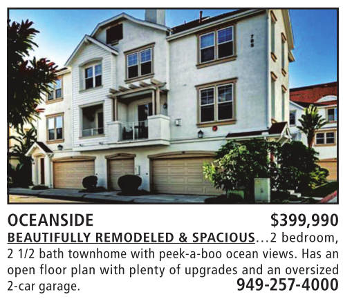 2 1/2 bath townhome with peek-a-boo ocean views. Has an open floor plan with plenty of upgrades and an oversized 2-car garage. 949-257-4000