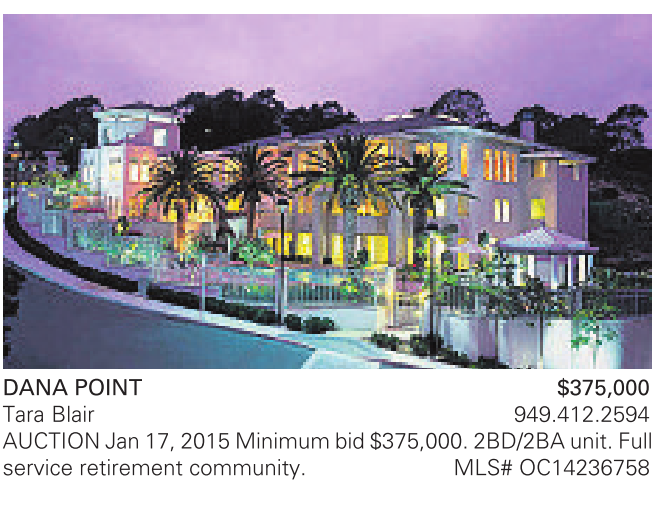 DANA POINT $375,000 Tara Blair 949.412.2594 AUCTION Jan 17, 2015 Minimum bid $375,000. 2BD/2BA unit. Full service retirement community. MLS# OC14236758