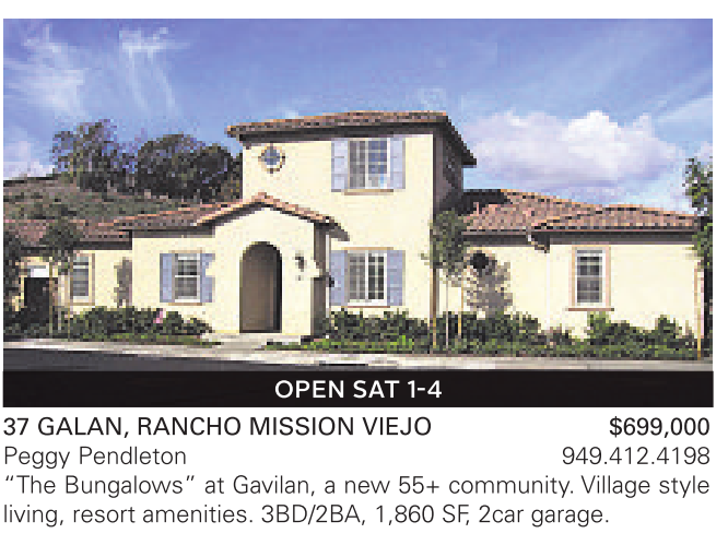 37 GALAN, RANCHO MISSION VIEJO $699,000 Peggy Pendleton 949.412.4198 “The Bungalows” at Gavilan, a new 55+ community. Village style living, resort amenities. 3BD/2BA, 1,860 SF, 2car garage.
