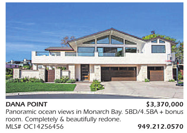 DANA POINT $3,370,000 Panoramic ocean views in Monarch Bay. 5BD/4.5BA + bonus room. Completely & beautifully redone. MLS# OC14256456 949.212.0570