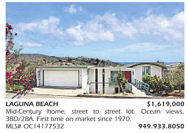 LAGUNA BEACH $1,619,000 Mid-Century home, street to street lot. Ocean views, 3BD/2BA. First time on market since 1970. MLS# OC14177532 949.933.8050