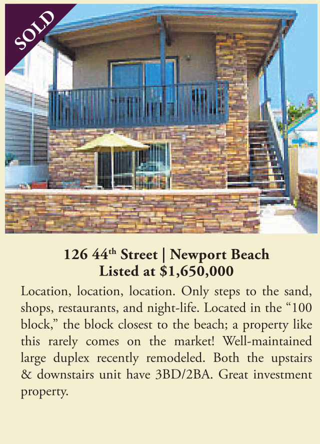 126 44 th Street | Newport Beach Listed at $1,650,000 Location, location, location. Only steps to the sand, shops, restaurants, and night-life. Located in the “100 block,” the block closest to the beach; a property like this rarely comes on the market! Well-maintained large duplex recently remodeled. Both the upstairs & downstairs unit have 3BD/2BA. Great investment property.